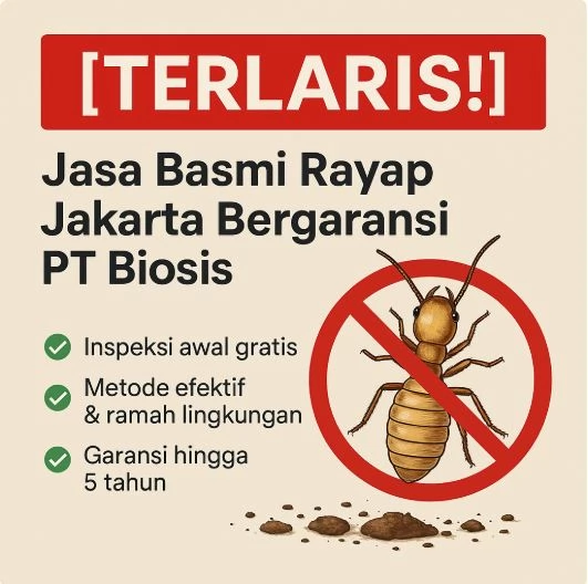 [TERLARIS!] Jasa Basmi Rayap Jakarta Bergaransi PT Biosis bukan sekadar layanan pengendalian hama, melainkan solusi menyeluruh untuk melindungi aset berharga masyarakat Jakarta. Dengan metode ilmiah, teknologi ramah lingkungan, tenaga ahli profesional, serta garansi panjang, PT Biosis membuktikan diri sebagai pilihan terbaik.