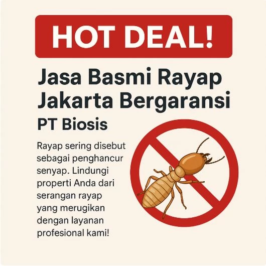 [HOT DEAL!] Jasa Basmi Rayap Jakarta Bergaransi PT Biosis bukan hanya sekadar layanan, melainkan investasi perlindungan aset jangka panjang. Dengan teknologi modern, tenaga ahli profesional, garansi nyata, serta filosofi ramah lingkungan, PT Biosis adalah mitra terpercaya untuk melindungi rumah, kantor, dan aset Anda dari ancaman rayap.